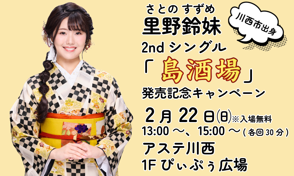 川西市出身の演歌歌手・里野鈴妹(さとのすずめ)がアステ川西にてミニライブを開催します。