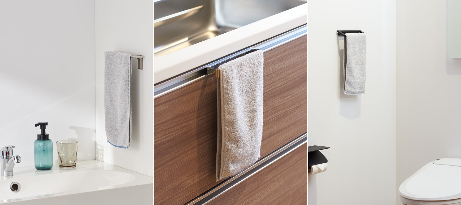 想像してみると、家で手を洗うシーンは、洗面所だけではなく、キッチン、トイレなど各ご家庭には、数か所のタオルバーがあり、毎回すべてのタオルを半分に折りたたんでセットするのは少しストレスかもしれません。また、タオルバーにかかっているタオルは、その内側や上の部分はあまり使われていないということに着目し、使うのに困らない程度の無駄のない長さにしています。コンパクトな設計にすることで、洗濯や収納時にかさばらないようなちょうど良いサイズ感となっております。