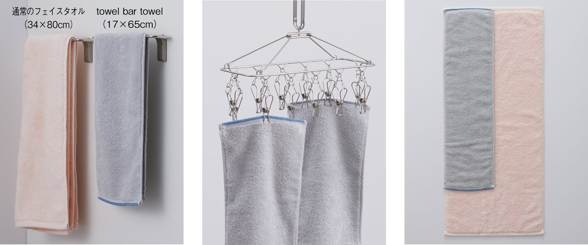 今回新しく登場する「抗菌防臭towel bar towel3枚セット」は、タオルバーにかける際のタオルを半分に折るという手間を減らしたい、手をふく時に使わない部分が多いというデザイナーが普段の生活から感じている煩わしさや思いから開発されました。