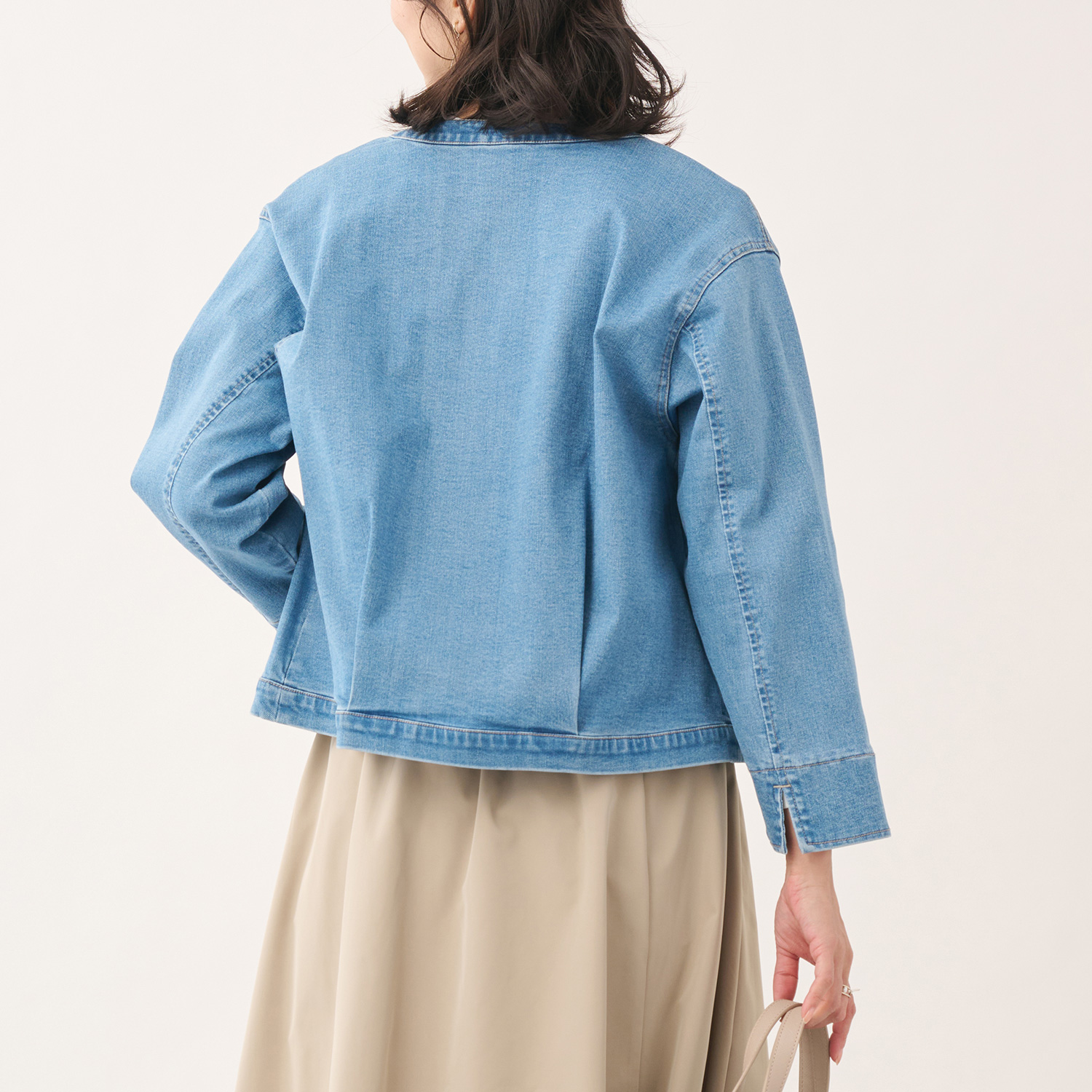 今回は、ストレッチデニムノーカラージャケットをご紹介いたします。