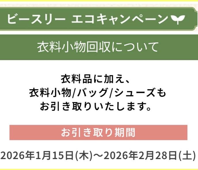 ☘️エコキャンペーン第2弾お知らせ☘️ ◆◆◆1月15日(木)から◆◆◆ エコキャンペーン第2弾‼️が始まります👍️ ご不用な衣料品に加え、 🧤衣類小物・👜バッグ・シューズ🥾 もお引……