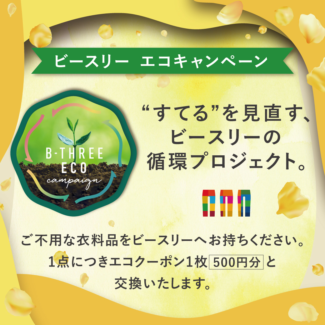 ☘️6/15(土)〜毎年恒例人気企画 今年もエコキャンペーンが始まります☘️ ご不用になった衣料品を店舗にお持ち頂くとビースリーのお買い物で 使用できるエコクーポン1……